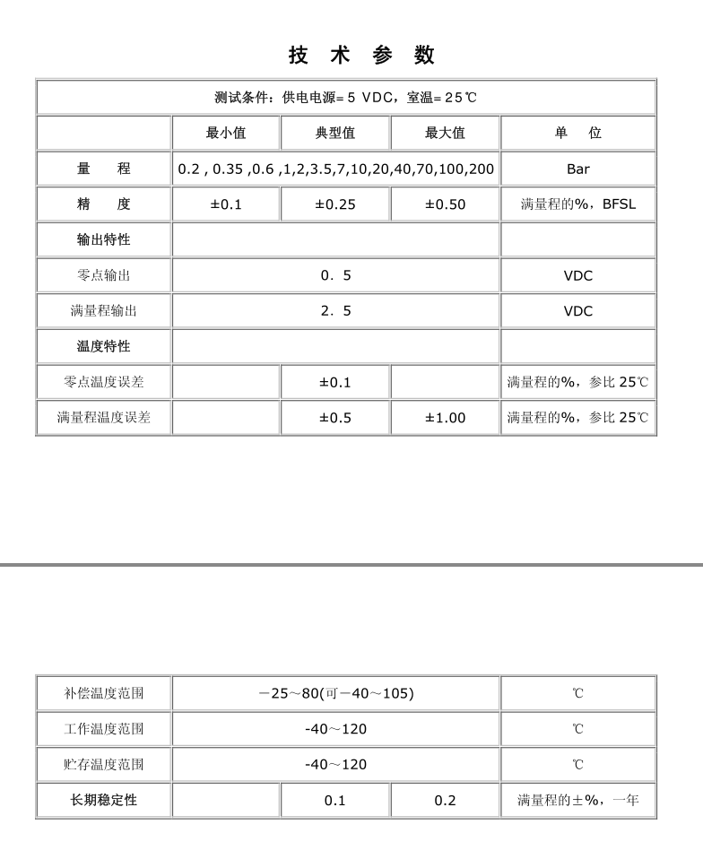 國產(chǎn)壓力變送器是將充油擴(kuò)散硅壓力傳感器芯體,通過激光焊接方式,裝入特定螺紋的壓力接口中組成。所有產(chǎn)品經(jīng)嚴(yán)格測試和篩選,利用MAX1452專用芯片進(jìn)行溫度補(bǔ)償和非線性校正,典型精度為0.25%,最高精度優(yōu)于0.1%,并保證在-25到80度工作溫區(qū)(最大可在-40到105度),全溫區(qū)測量精度在1%以內(nèi),5V供電,輸出0.5-2.5V電壓信號(hào),適用于各種不同壓力測量產(chǎn)品的組裝和生產(chǎn)。