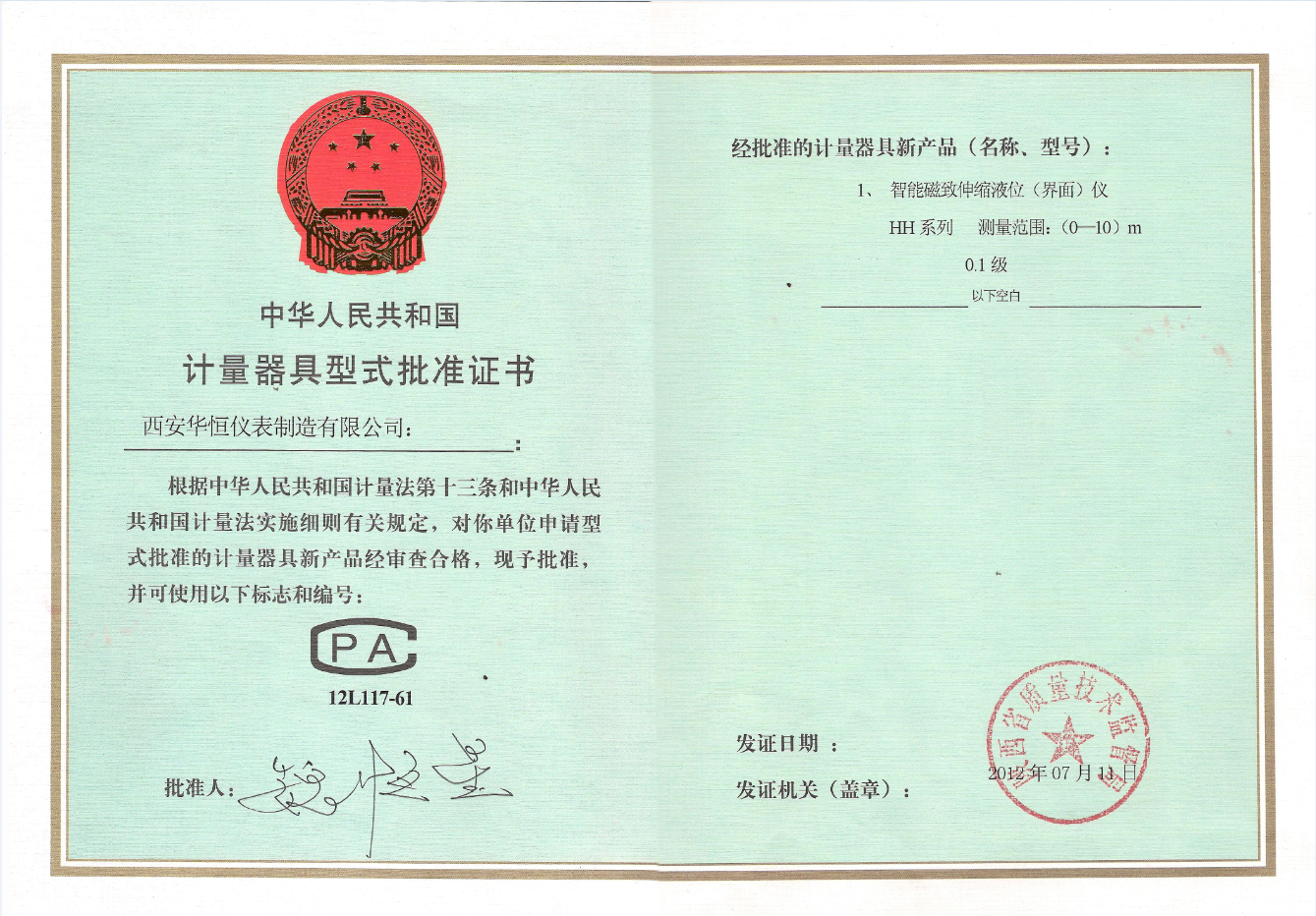 智能磁致伸縮液位儀計量器具型式批準(zhǔn)證書