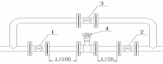 不允許直接在流量計測量管前后端安裝閥門、彎頭等極大改變流體流態(tài)的部件,如果需要在流量計前后管道上安裝閥門、彎頭等部件也應(yīng)盡量保證前后直管段長度,直管段要求前10D,后5D,對于新完工的工藝管道,應(yīng)先進(jìn)行初步吹掃后再安裝流量計。