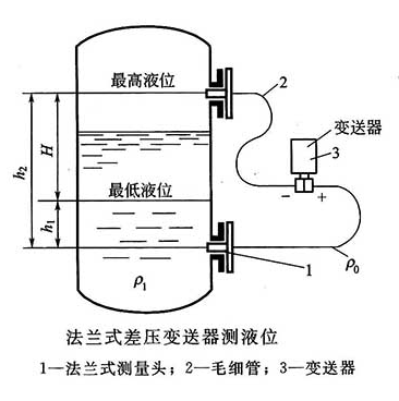其中,H為儲罐液位,H0為差壓式液位變送器安裝位置距儲罐底部的距離,P1為儲罐內(nèi)部液體表面靜壓,P0為儲罐內(nèi)液體本身產(chǎn)生的壓力,ρ液為儲罐內(nèi)部液體的密度,ρ汽為儲罐內(nèi)部氣體的密度,P+為差壓式變送器正壓腔室內(nèi)部壓力,P-為差壓式變送器負(fù)壓腔室內(nèi)部壓力。