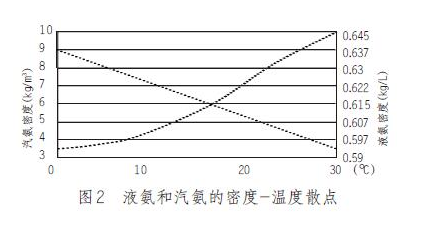 為了進一步分析被測介質(zhì)氨的密度與溫度之間的對應(yīng)關(guān)系,根據(jù)表1的數(shù)據(jù),描出了汽氨和液氨的密度—溫度關(guān)系散點圖,見圖2。